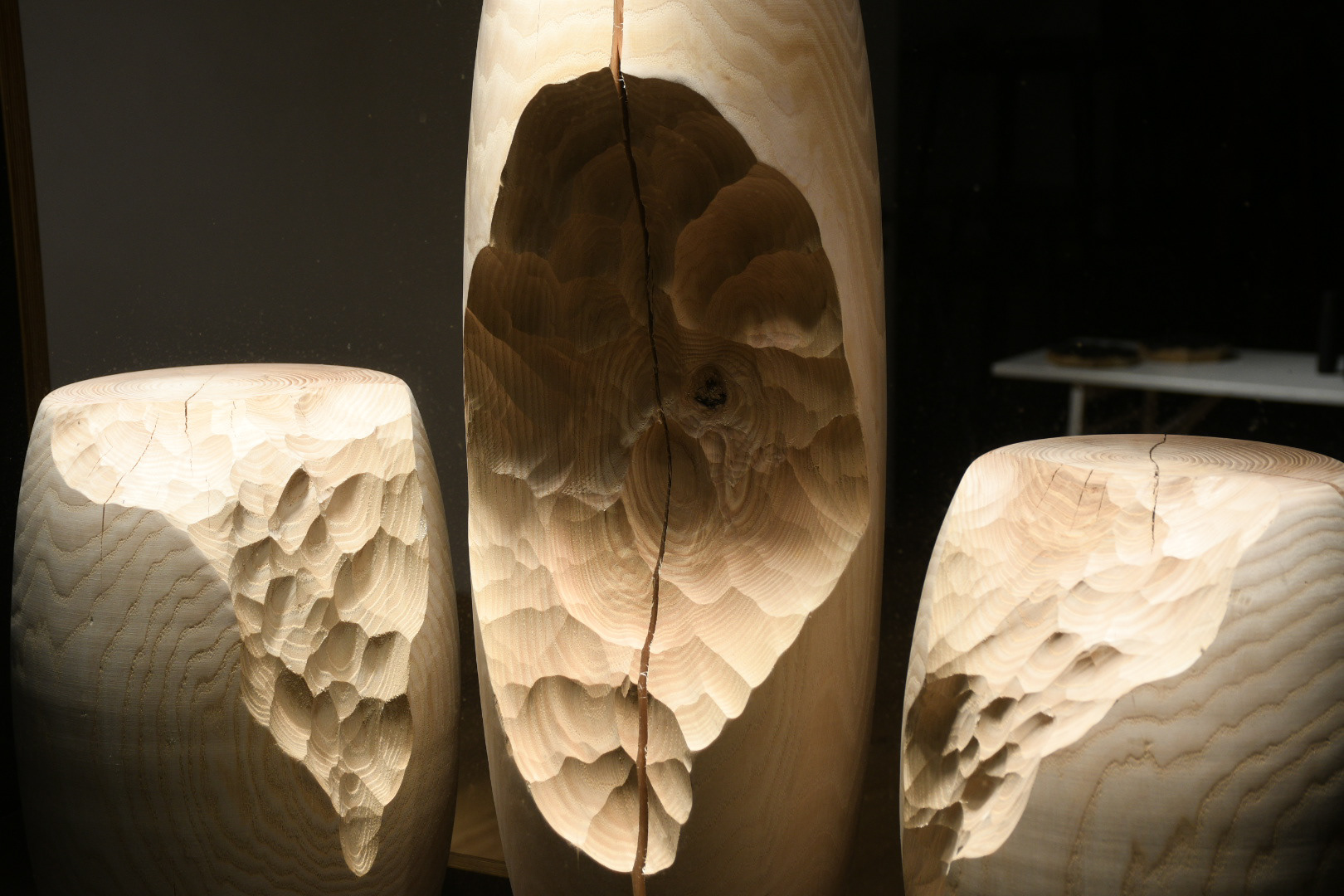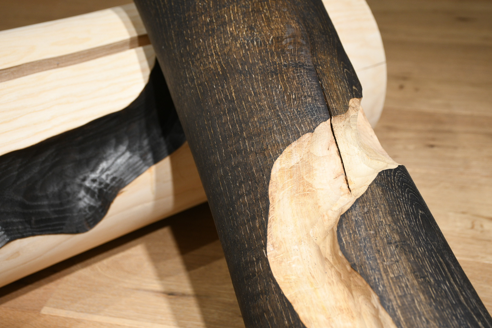 Die Ausstellung zeigt monumentale und feine Holzobjekte, die knistern und knacksen...